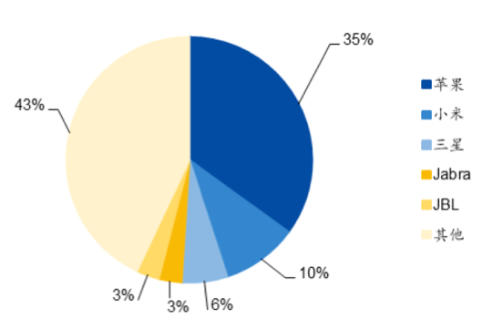 Marka dağıtımı açısından bakıldığında, TWS kulaklık pazarı ilk olarak Apple tarafından patlatıldı. Birkaç yıllık geliştirme sürecinin ardından ürünü AirPods, orta ve üst düzey pazarda çok yüksek bir pazar payına sahiptir. Counterpoint'in analiz verilerine göre 2020'nin ikinci çeyreği itibarıyla TWS pazarında ilk üç şirket Apple (yüzde 35), Xiaomi (yüzde 10) ve Samsung (yüzde 6). pazar.