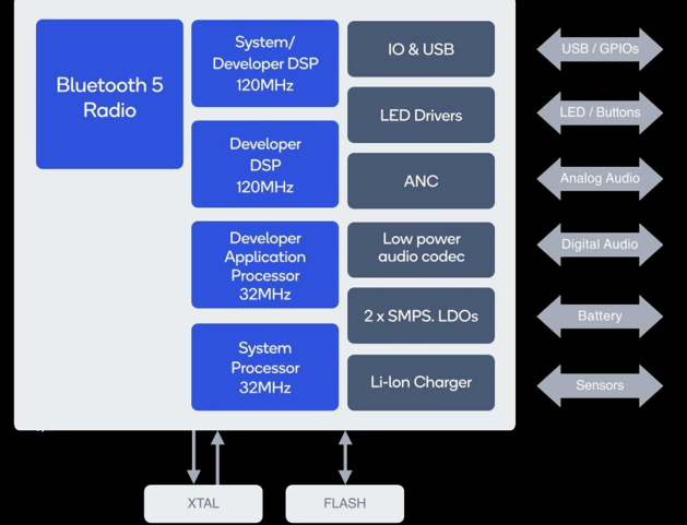 Qualcomm QCC5124 çip üzerinde sistem (SoC), daha uzun ses çalma için düşük güç tüketimi ile sağlam, yüksek kaliteli, kablosuz Bluetooth dinleme deneyimi için küçük cihazların ihtiyaçlarını karşılamak üzere tasarlanmıştır. QCC5124 mimarisi, düşük güç tüketimi ile yüksek performans için tasarlanmıştır. Önceki teknolojisiyle karşılaştırıldığında, güç tüketimi yüzde 65'e kadar azaltılabilir ve neredeyse tüm çalışma modlarında daha uzun ses oynatımına olanak tanır.