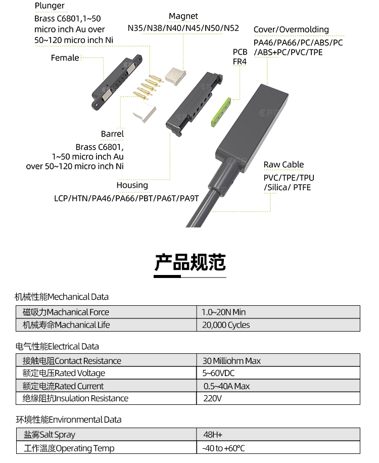 Manyetik konektör, pogo pin konektörü temelinde bir mıknatıs kombinasyonudur ve RuFeB kalıcı mıknatısların kullanımı, erkek ve dişi arasında sağlam ve güvenilir bir bağlantı sağlar. Manyetik pogopin konektörü, geleneksel konektörlerin sahip olmadığı uygun yerleştirme, güvenlik, kompakt boyut, kolay temizleme ve yanal çıkarma avantajlarını oluşturur ve gerçekten yüzde 100 otomatik konumlandırma, otomatik bağlantı, hızlı yerleştirme, harici bir kuvvetle ayırma, Zorlama bağlantının kesilmesi, cihazın bağlantı portuna ve diğer işlevlerine zarar vermez; hızla popüler hale geldi ve birçok alanda kullanıldı.
